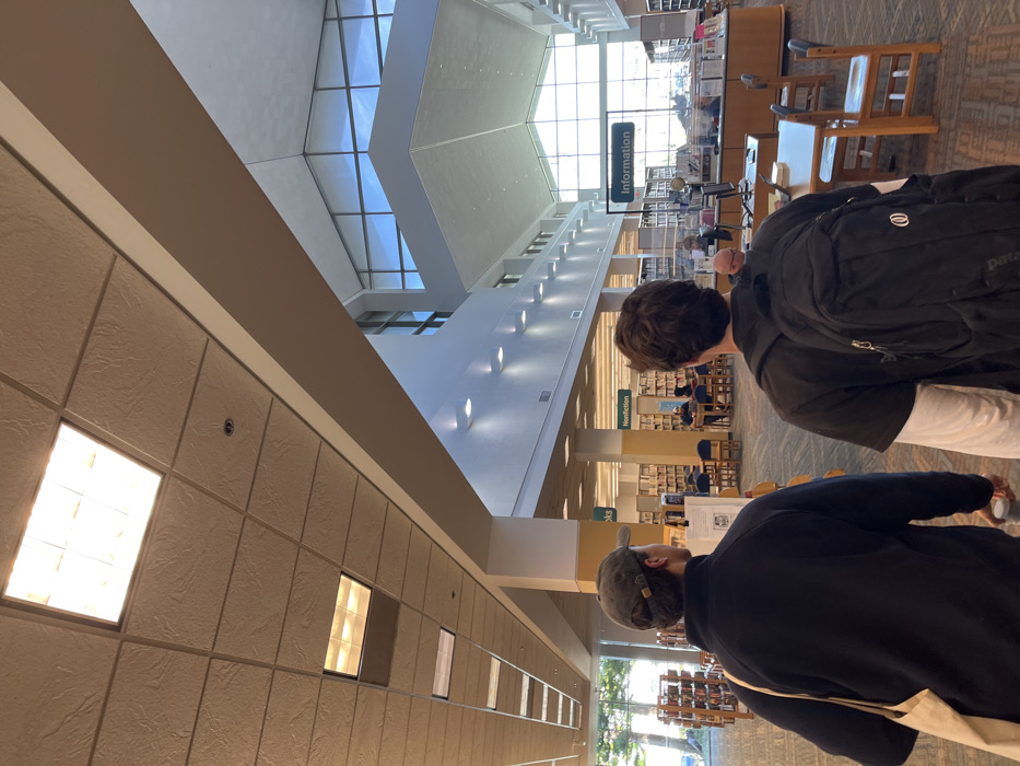 Two young people walk through a large library. The building has a high ceiling, with large windows allowing natural light. Bookshelves line the walls. Signage for "Information" and "Nonfiction" is visible. One individual wears a black backpack, while the other sports a baseball cap. The library appears modern, with sleek architecture and recessed lighting.
