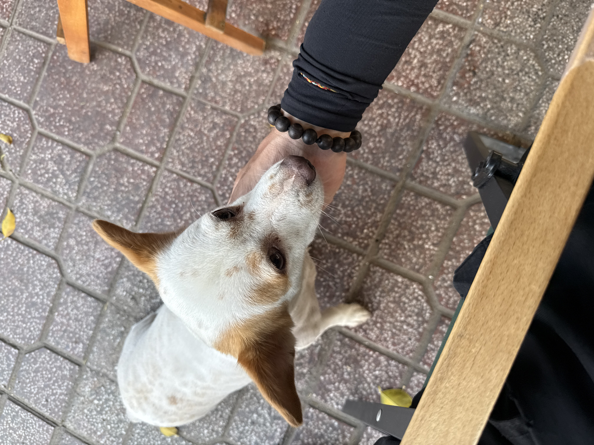 An overhead shot shows a person petting a white and tan dog on a tiled surface. The person is wearing a black long-sleeved shirt and a bracelet of dark wooden beads. The dog is looking up at the person's hand. Parts of two wooden chairs are visible at the edges of the frame. Yellow leaves are scattered on the tiles. The location is Bắc Nha Trang, Vietnam.