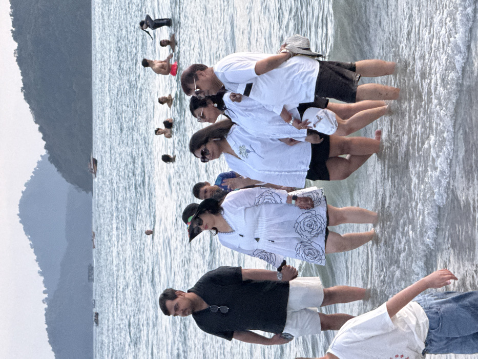 The image depicts a coastal scene at Cenang Beach, Malaysia. In the foreground and midground, a group of six adults and one child stands in the shallow ocean water, with waves reaching approximately mid-calf level. From left to right: a man in a black polo shirt and white shorts holds a smartphone and is holding hands with the woman next to him; he has sunglasses on his collar and a watch on his left wrist. Next, a woman wears a white long-sleeved tunic dress with black embroidered rose patterns, black shorts, a wide-brimmed black hat, and dark sunglasses; she also wears a watch on her left wrist. A young boy in a blue shirt is partially visible behind her. To their right, a woman in a white long-sleeved button-down shirt, black shorts, and dark sunglasses stands. Adjacent to her, another woman wears a white long-sleeved button-down shirt with a light green floral pattern, black shorts, and dark sunglasses, holding a white cap and a light-colored bag. The final individual in this primary group is an older man in a white polo shirt with a black stripe, dark shorts, and sunglasses, with a patterned bag slung over his shoulder. In the extreme lower left foreground, a child in a white t-shirt and blue denim shorts is partially visible, facing away from the camera. In the mid-distance of the ocean, multiple other individuals are partially submerged, appearing to swim or stand in the water. One male figure is visible wearing red swimming shorts, and another is in a black, long-sleeved swimsuit or wetsuit. Several small boats are scattered across the water further in the background. The horizon is dominated by multiple large, vegetated landmasses or islands, suggesting a mountainous coastline, under an overcast sky.