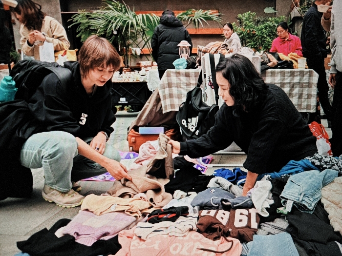 The scene depicts an active outdoor secondhand market within the Chongqing High-tech Zone, China. In the foreground, two individuals are crouched on a light-colored paved ground, sifting through large piles of clothing. The person on the left has short, reddish-brown hair, wears a black hooded sweatshirt with "UP 3" text, light blue jeans, and light beige sneakers, with a black jacket draped over their left shoulder and a turquoise water bottle nearby. Their right hand is extended into a pile of assorted garments, including sweaters and shirts in various pastel colors. The individual on the right has dark, wavy, shoulder-length hair, wears a dark knitted top, and uses their right hand to examine another pile of clothing consisting of jeans, sweaters, and t-shirts. In the mid-ground, multiple market stalls are visible, featuring tables covered with checkered tablecloths and displaying various items. An Adidas backpack hangs near one stall. Several other individuals are present in the background, browsing or attending to the stalls. Potted green plants, including palms, are visible, indicating an open-air or semi-enclosed market environment.