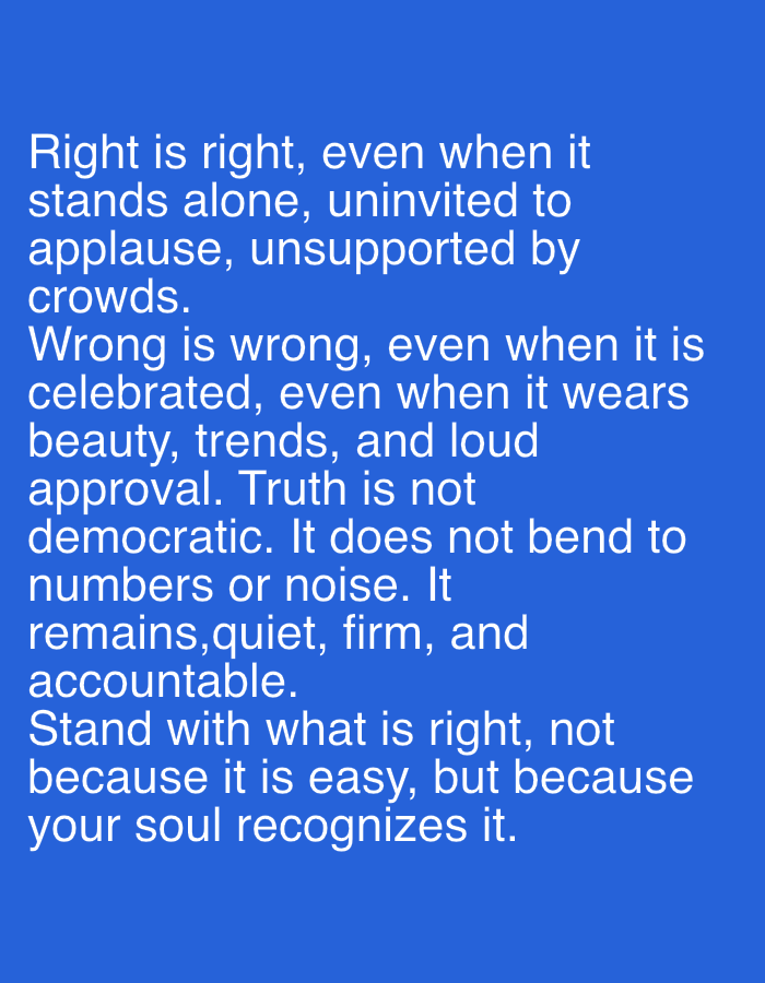 The image displays a powerful message about morality and truth. It asserts that right remains right even in isolation, while wrong remains wrong despite popularity or superficial appeal. Truth is characterized as unwavering, not subject to popular opinion or clamor. The text encourages individuals to stand for what is right, not for convenience, but because their conscience recognizes it. The message is set against a plain blue background.