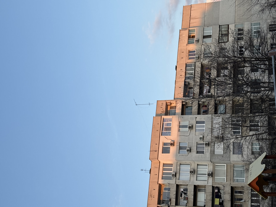 A multi-story, grey concrete panel apartment building, characteristic of post-WWII socialist-era architecture found in residential districts of Sofia, Bulgaria, occupies the mid-ground and background. The upper portion of the building, including a distinctive top-floor section and roofline, is illuminated by warm, golden sunlight, creating a stark contrast with the darker, shaded lower facade. The structure features numerous windows, a mix of older and newer PVC replacements, along with multiple external air conditioning units mounted irregularly across the grey exterior. Several open balconies display hanging laundry. Various television antennas, including a prominent Yagi antenna, are installed on the roof. Bare deciduous trees with intricate branch patterns are positioned in the mid-ground, partially obscuring the building's lower levels. A portion of a playground structure, featuring an orange and light-colored roof section, is visible in the bottom-left foreground. The sky above is predominantly clear and light blue, with faint wisps of clouds catching the golden light on the right horizon. No individuals are present in the visible scene.