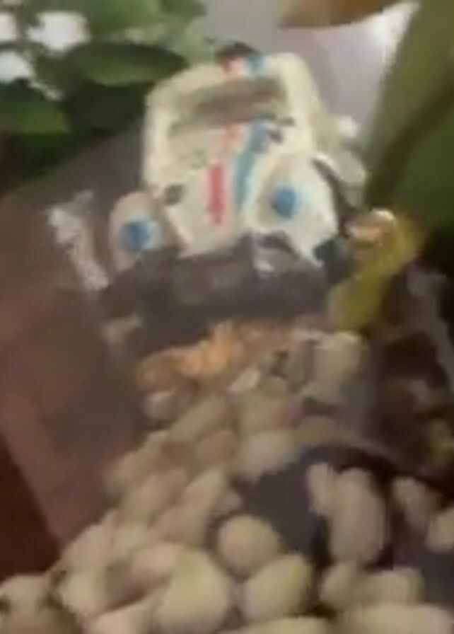 inside of a fish tank. The tank's bottom is covered with small white pebbles and some dark substrate. Inside, there are several decorative items: a small orange octopus figure, a white and blue toy car (resembling a Volkswagen Beetle), a green turtle figure with colorful markings, and a skull-shaped ornament. There's also some artificial greenery in the background. The camera moves slightly, providing different angles of the tank's interior.