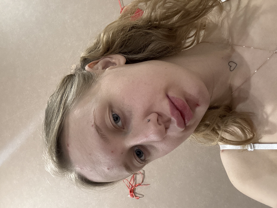 The image displays a close-up portrait of a young adult female, reportedly located in Novoalexandrovka, Russia. She possesses fair skin, blue eyes, and light brown or blonde wavy hair, with some strands appearing to be pulled back by a light-colored hair accessory on the right side of her head. A small stud piercing is present in her left nostril. A black outline heart tattoo is visible on the right side of her neck, positioned above a delicate necklace with a small pendant. Her left shoulder displays a white bra strap. The subject's lips appear swollen, with a distinct reddish mark or scab located on her lower lip. Multiple small red blemishes are evident on her forehead and chin area. She looks directly into the camera. The background consists of a plain, light-colored wall. A red, abstract, tangled object, possibly a decorative element or wire, is affixed to the wall behind her head on the left side of the frame.