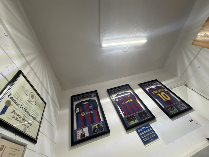 Three framed Barcelona football jerseys hang on a white wall. The first jersey features the Spotify logo, the second has the UNICEF logo, and the third is labeled "Ronaldinho 10". Below the jerseys is a display of small FIFA patches. To the left, a framed award with a blue ribbon is visible, along with part of another framed diploma. A long fluorescent light is mounted on the ceiling above.