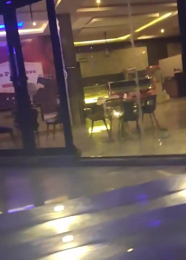 exterior of a building at night. The lighting is dim with purple and yellow accent lights. The entrance is visible through a glass door, revealing a brightly lit interior with tables and chairs. A person walks into the scene, passing by a poster on the wall and a couple of empty chairs. The camera moves slightly, capturing more of the building's exterior, including a gate. Loud music plays in the background.