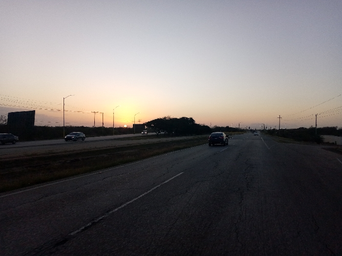 A road stretches forward, slightly cracked and worn, under a dusky sky where the sun hangs low on the horizon. Several cars are scattered across the scene, moving along the road and on a parallel one in the distance. Lamp posts line the side of the road and power lines stretch across the top of the frame, adding to the sense of distance. Bushes and trees are visible on either side of the road, punctuating the landscape.