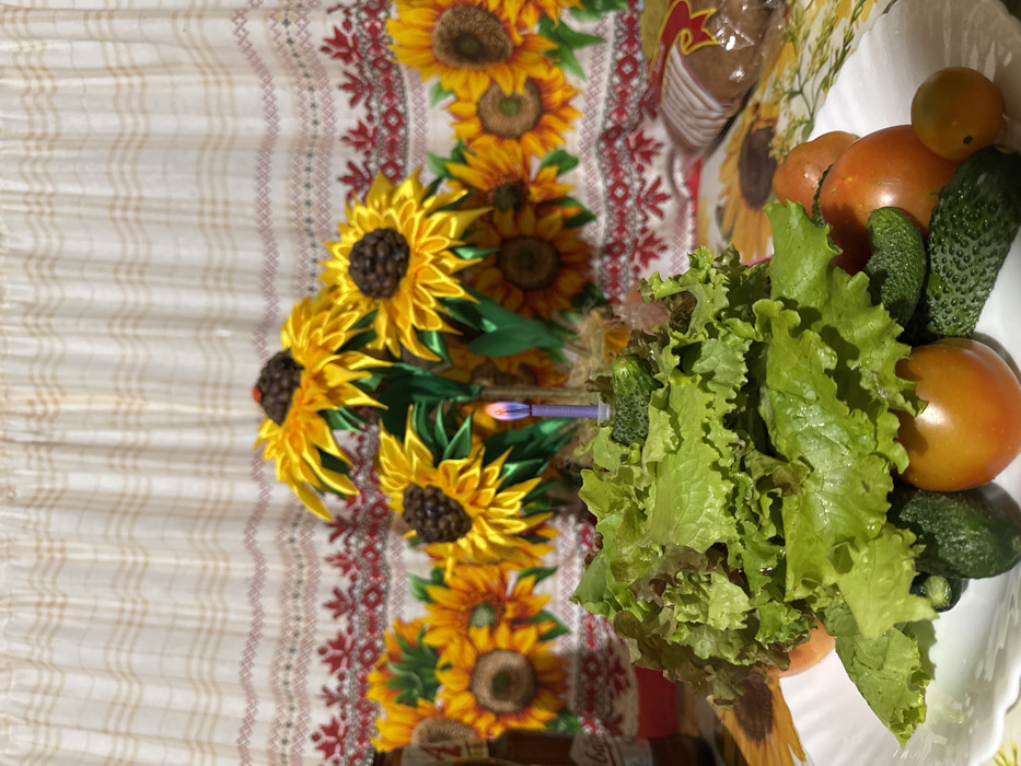 The image displays an indoor scene, consistent with a domestic setting in Парэчча, Belarus. The specific address or precise location within the city is not visually discernible from the image content. In the foreground, a white plate with a fluted rim is centrally positioned, bearing a mound of fresh, green leaf lettuce. Arranged around the lettuce are several whole, dark green cucumbers and multiple orange-red tomatoes of various sizes, including a smaller yellowish-orange tomato. A slender, lit purple candle is inserted vertically into the lettuce, suggesting a celebratory context. A small piece of a gherkin is visible near the candle. The items are situated on a tablecloth featuring a sunflower pattern. The midground contains an arrangement of artificial sunflowers, crafted from yellow fabric petals and dark brown centers, with green ribbon stems. To the far left, a brown glass bottle is partially visible. To the right, a translucent plastic bag containing what appears to be baked goods is partially visible on the tablecloth. The background is composed of a light-colored fabric, likely a curtain or tapestry, adorned with subtle horizontal stripes and a prominent lower border featuring red and white embroidered or woven folk-style patterns. No people are visible.