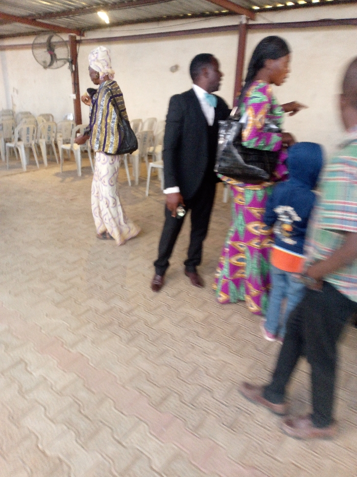 The image depicts an indoor scene in the city of Television, Nigeria, likely a communal hall or event space