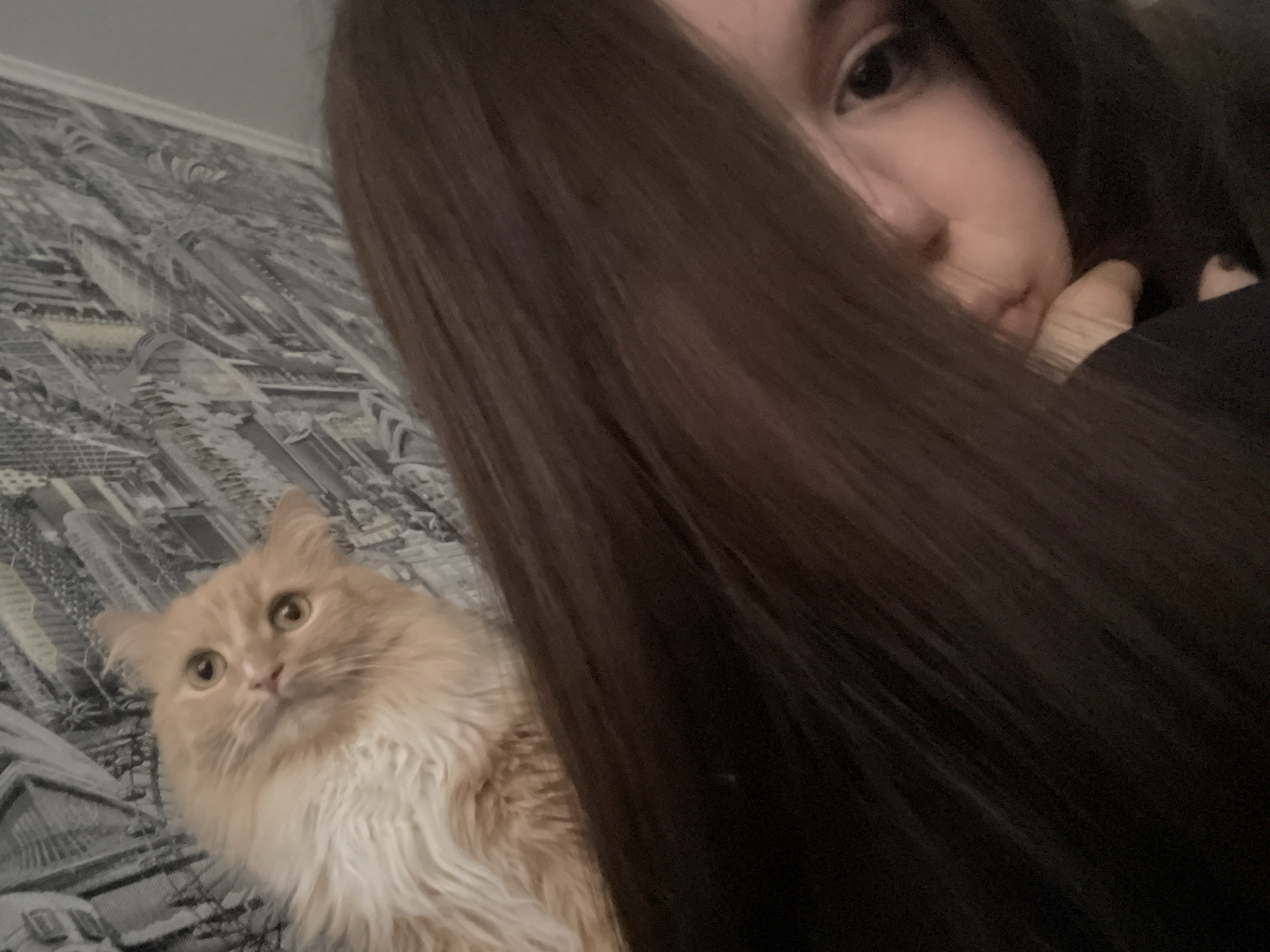 The image captures an indoor scene in the city of Chaikovsky, Russia. A long-haired, light orange and cream-colored domestic cat occupies the upper left portion of the frame, gazing directly at the viewer with wide, round, yellowish-green eyes. Its fur is dense, with a distinct white patch on its chest. In the lower right quadrant, a human subject's face is partially visible, obscured primarily by long, dark brown hair. The right eye, nose, and a portion of the mouth are discernible. The subject appears to be resting their chin on a hand or arm, clad in dark material. The background features a wall covered in patterned wallpaper, displaying monochrome abstract or architectural designs in shades of gray, black, and white.