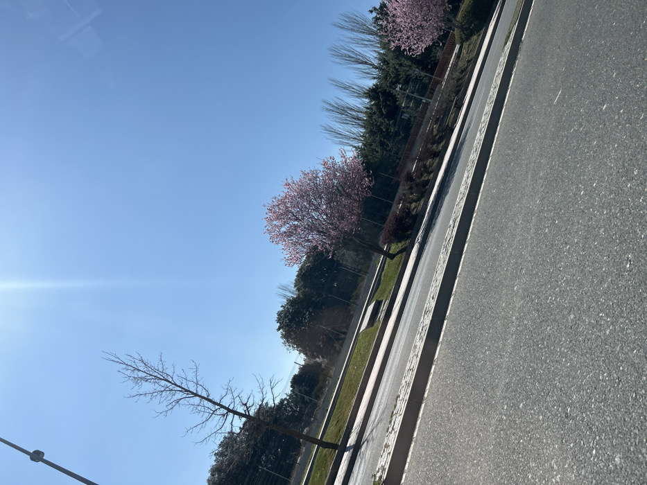 The image displays a daytime outdoor scene in Ávila, Spain, captured with a discernible upward and rightward tilt. The foreground is dominated by a grey asphalt road, bordered on the right by a textured concrete curb and a narrow unpaved strip. Beyond this strip lies a manicured grassy median, ascending gently from left to right. Within the median, a tall, bare deciduous tree with dark branches stands prominent on the left. Further to the right, two smaller trees are in full bloom with pink blossoms, indicative of spring. Behind these, a dense line of darker green evergreen trees and bushes runs horizontally across the mid-ground. A metal wire fence is visible behind the bare tree on the left, continuing behind the other vegetation. A small, dark, rectangular object rests on the grassy area near the center. In the extreme upper left, a portion of a vertical light pole is visible. The sky occupies the upper portion of the frame, appearing clear and bright blue, with a significant lens flare originating from the upper left, suggesting direct sunlight. No individuals, vehicles, or explicit actions or interactions are visible in the scene.