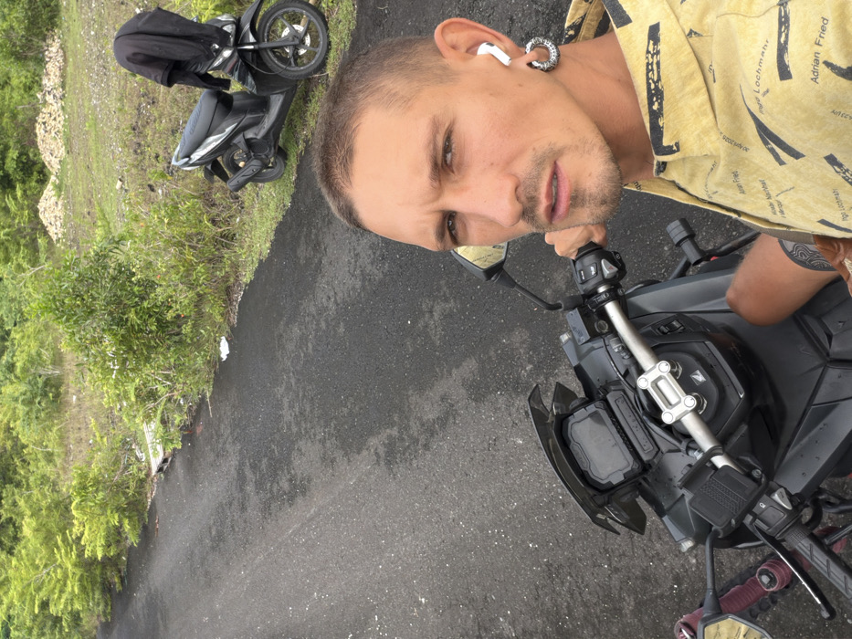 A fair-skinned man with short blonde hair, an earring, and a white earbud in his left ear poses with a motorcycle. He wears a yellow button-up shirt with black designs. The motorcycle has black fairings and silver handlebars. Behind the man and the motorcycle is a paved road. Lush green vegetation lines the side of the road. A second black motorcycle is parked to the side of the road.