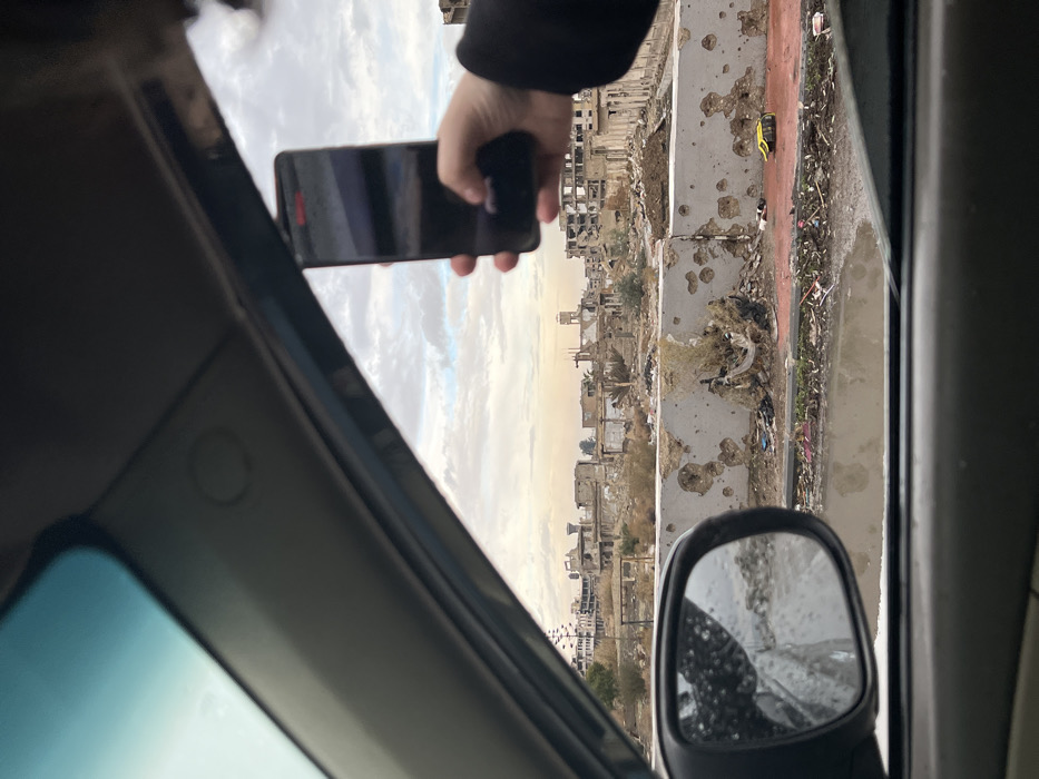 The image captures a perspective from inside a vehicle, looking out the passenger-side window at an urban landscape identified as Al-Qaboun Municipality, Syria