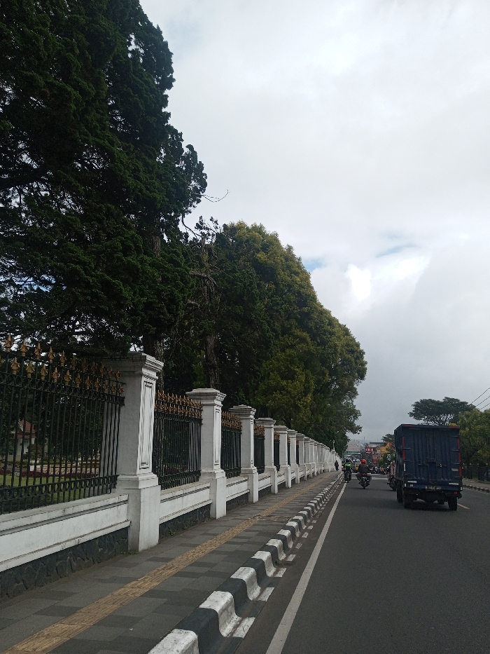 The image depicts a roadside scene in Thotagamuwa, Sri Lanka, under an overcast sky. The vantage point is from the road, looking forward. On the left, a long, ornate fence stretches into the distance. This fence is composed of regularly spaced white concrete pillars with decorative capitals, connected by dark, wrought-iron sections topped with golden spikes. Behind the fence, a dense line of tall, dark green coniferous trees, possibly cypress, forms a prominent natural barrier, with their foliage extending high into the sky. Adjacent to the fence is a paved sidewalk, constructed from grey rectangular tiles, featuring a yellow tactile paving strip running parallel to the curb. A black and white striped curb separates the sidewalk from the two-lane asphalt road. On the right side of the image, the dark grey asphalt road is visible. A dark blue box truck is positioned in the right lane, moving away from the viewer, with its rear facing the camera. Behind and to the left of the truck, at least two motorcycles are present, each operated by a rider, also traveling in the same direction. Additional vehicles are indistinctly visible further down the road, suggesting ongoing traffic. The sky is predominantly light grey and overcast with dense cloud cover, though some lighter patches are discernible. In the far distance, beyond the road and surrounding vegetation, elements of a town or city, including buildings and more trees, are visible beneath the cloudy horizon. The overall lighting is diffused, consistent with an overcast day.