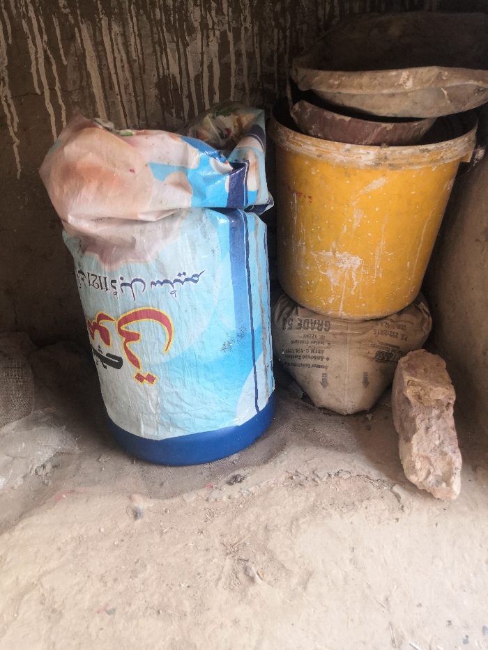 The scene depicts a storage area in Akhundzadakhail, Pakistan. In the foreground, a large, light blue and white woven sack, printed with Farsi/Urdu script and a red graphic, covers a cylindrical object. A smaller, multi-colored sack is loosely draped on top of it. To the right, a dirty yellow plastic bucket, containing at least two stacked, weathered bowls or lids, rests on a smaller, off-white woven sack labeled "GRADE 51" and "ASTM C-150 TYPE." A rough, light brown stone fragment lies on the uneven dirt floor to the right. The background wall is a light color, exhibiting multiple dark vertical streaks consistent with water runoff or staining. No individuals are present in the image.