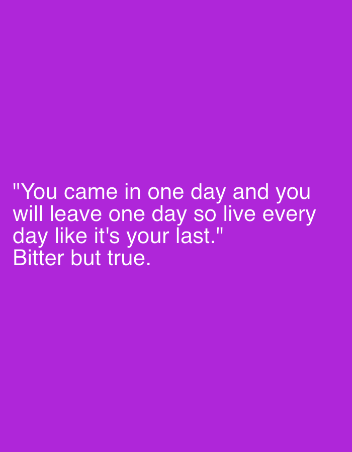 A purple background displays a quote in white text. The quote reads, "You came in one day and you will leave one day so live every day like it's your last." Below the quote, the phrase "Bitter but true" is written. The text is positioned in the center of the image, with adequate spacing above and below to maintain visual balance. The overall tone is contemplative and thought-provoking.