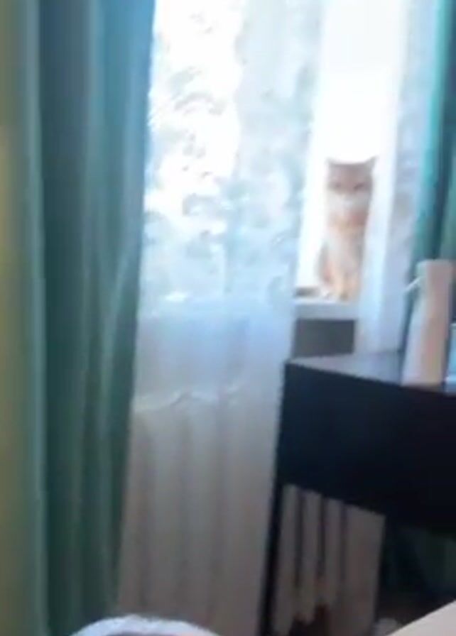 The video opens with a blurred view of a room with green curtains and a lamp in the foreground. The camera then pans to reveal a window with sheer, white patterned curtains. An orange cat sits on the windowsill, framed by the curtains. A dark-colored desk with a white vase and pens is visible in front of the window. The cat looks directly at the camera.