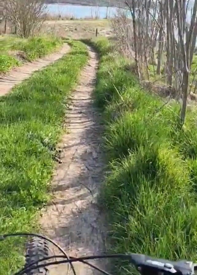 A first-person point of view video shows someone riding a mountain bike on a dirt path. The path is narrow and winding, with grass growing on either side. Bare trees line the path on the right. In the distance, a body of water can be seen. The day is sunny and bright.