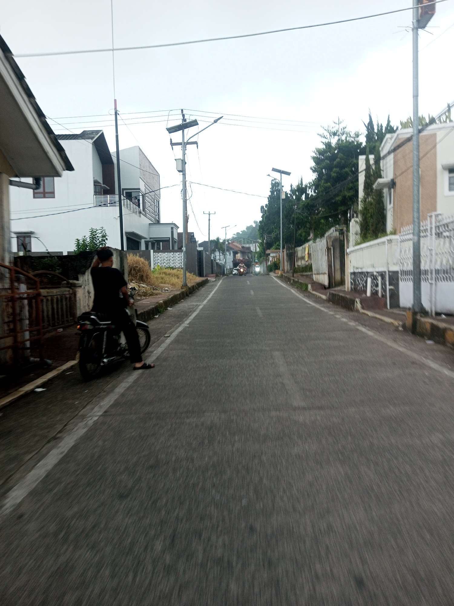 An overcast daytime scene depicts a residential street in Kan Beit, Myanmar. In the immediate left foreground, a person wearing a black t-shirt and dark pants is seated on a dark-colored motorcycle, facing away from the camera, with their right hand raised towards their head. The motorcycle is parked on a paved shoulder, delineated by a solid white line and separated from the main asphalt road by a dashed white line. The road surface and immediate foreground exhibit motion blur. To the left of the motorcycle, a low concrete wall with dry vegetation and a rusty metal railing are visible, in front of a modern, multi-story white house featuring a dark roof, brown trim, and a balcony. Utility poles carrying power lines extend along the left side of the street. On the right side, houses with white ornamental fences and walls are visible, interspersed with tall evergreen trees and other foliage. Utility poles with attached streetlights, some appearing solar-powered, also line this side. The street extends into the distance, appearing to curve slightly uphill, with at least two distant vehicles, possibly motorcycles, visible with active headlights. The sky is uniformly overcast.