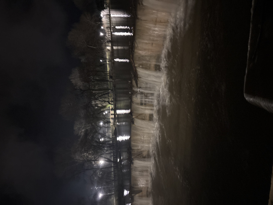 At night, a river flows over a stepped dam, illuminated by a row of lights on the left bank. Bare trees line the bank, their silhouettes contrasting with the dark sky and reflecting in the calm water above the dam. The water cascading over the dam appears blurred due to the long exposure, creating a flowing effect. The right side of the image is dominated by darkness.