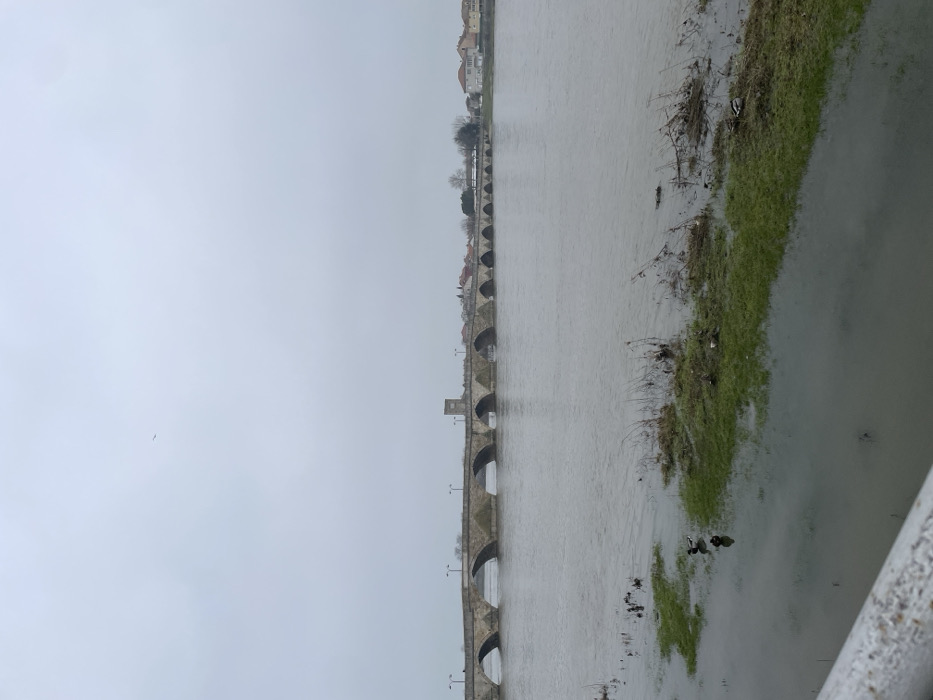 The image displays a wide view of the Maritsa River in Svilengrad, Bulgaria, featuring the historic Mustafa Pasha Bridge (Old Bridge) under an overcast sky. The long, multi-arched stone bridge, constructed from light-colored masonry, spans the river from left to right across the midground. Numerous black streetlights are regularly spaced along the bridge's top surface. A prominent square clock tower is situated approximately mid-span on the bridge. Beyond the bridge on the far bank, residential buildings with orange-tiled roofs and scattered bare trees are visible, indicating a populated area. In the foreground, the riverbanks are partially submerged, displaying patches of vibrant green grass interspersed with areas of murky grey water and submerged brown vegetation. Several ducks, primarily dark-feathered, are present on these grassy sections and in the shallow water near the immediate left bank. A grey, weathered metallic railing or structure is visible in the bottom left corner, suggesting the vantage point. The river water itself is a uniform, opaque grey. A single bird, possibly a seagull or similar, is discernible flying in the distant, uniformly light-grey sky. No human figures or active vehicles are visible.