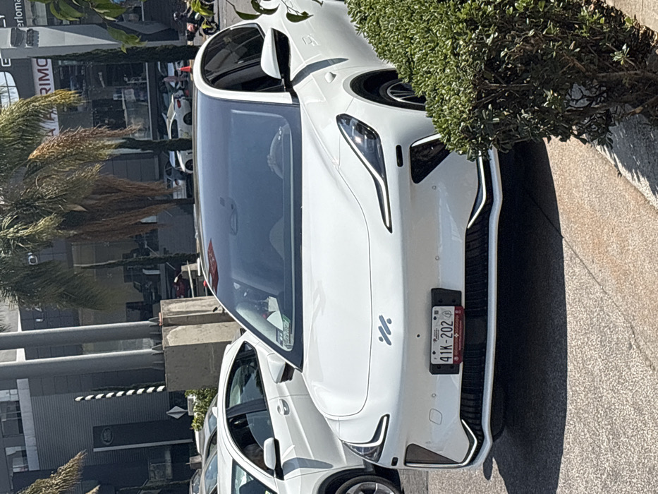 A white car, possibly an electric vehicle, sits parked on pavement next to a bush