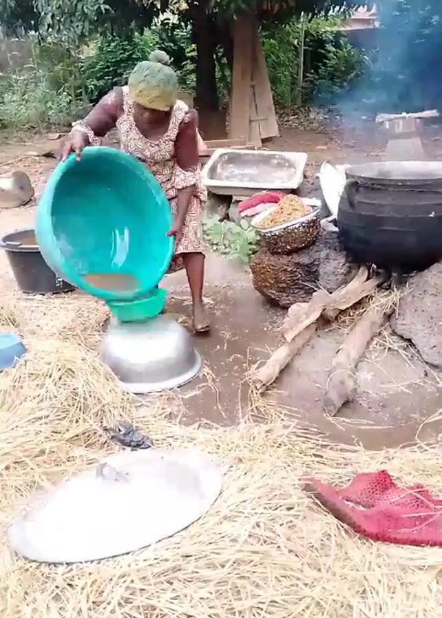 A barefoot woman in a patterned dress and headwrap is shown in a medium shot outside amidst greenery and a dirt surface covered in dry straw. She is pouring the contents of a large, teal-colored basin into a smaller, green bowl placed on top of a silver bowl. Various containers and cooking utensils are scattered around her, including buckets, baskets, and a large black pot on a makeshift stove fueled by wood, with smoke rising from it. There are also what looks like a wet red towel, a white pan, and a white container to the side. The scene suggests an outdoor cooking or food preparation process.