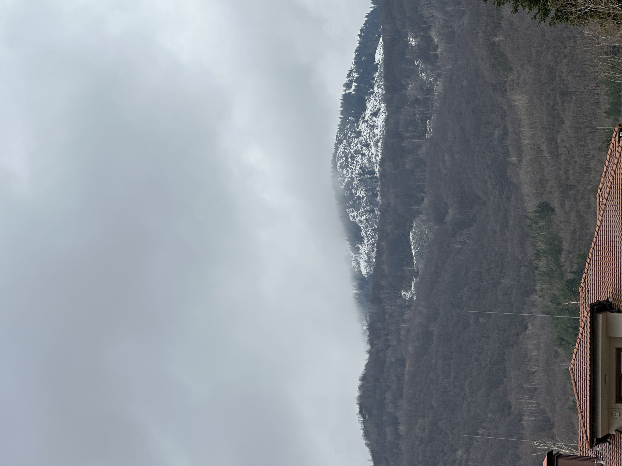 The image presents a detailed view of Vitosha Mountain as observed from an outlying district of Sofia, Bulgaria, likely situated at the mountain's foothills. The upper two-thirds of the frame depict the mountain, with its peak exhibiting patchy snow cover, interspersed rocky outcrops, and dense coniferous tree clusters, particularly on the right side. A layer of low-hanging mist or cloud partially obscures the mountain's crest, blending into the uniformly overcast, light grey sky that occupies the top quarter of the image. Below the snowline, the mountain slopes are heavily forested with predominantly deciduous trees, currently devoid of foliage, indicating a winter or early spring season. Patches of evergreen trees and lighter-barked deciduous trees are visible throughout the bare forest. The lower third of the image features the upper portion of a residential building. This structure is characterized by a distinctive terracotta-colored tiled roof. A reddish-brown chimney stack is visible on the left side of the roof. Below the roofline, a segment of a light-colored (beige or cream) building facade with a dark-framed window is present. Two thin, vertical metallic rods, consistent with lightning rods or antennas, extend upwards from the roof, silhouetted against the bare forested slopes. No individuals or discernible actions are present. The lighting is soft and diffuse, consistent with heavy cloud cover.