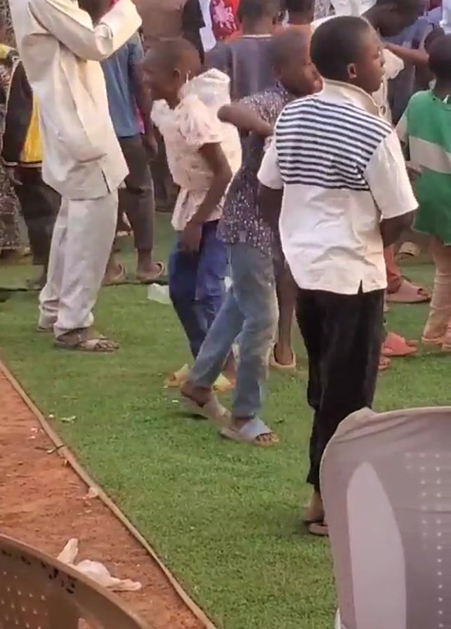 The video depicts a lively outdoor gathering, possibly a celebration, with numerous people, including children, on what appears to be artificial grass. The camera is positioned among seated individuals, providing a ground-level perspective of the event. The focus is on the children who are actively dancing and moving to the music. They are dressed in casual clothes, with some wearing sandals. Adults are seen standing around, some observing the children, and one is talking on a mobile phone. The atmosphere appears festive. The setting includes a border of soil or dirt along the edge of the artificial grass. There are discarded pieces of white material or paper strewn on the ground.