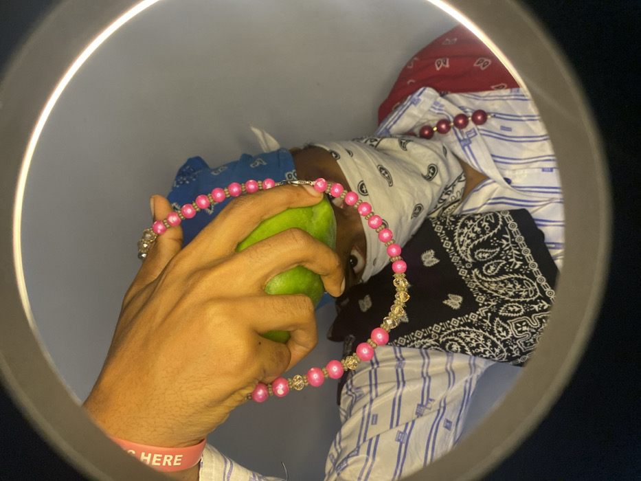 A person is depicted in a medium close-up, framed by a circular light source, in an indoor setting in Ngleshi Amanfro, Ghana, against a plain light blue-grey wall. The individual's face is largely obscured by a blue bandana covering the head and a white bandana covering the nose, mouth, and chin, leaving only the eyes visible, which are directed at the viewer. A tan-complexioned hand, wearing a pink wristband on the left wrist and a silver-colored ring on the middle finger, holds a single green fruit (resembling a lime or small unripe mango) directly in front of the subject's upper face. A necklace composed of large, spherical pink beads alternating with smaller, faceted clear/gold beads is draped over the hand and the green fruit. The subject wears a white collared shirt with thin blue vertical stripes. A black bandana with white paisley patterns is draped over the left shoulder and chest area. A portion of a red bandana with white patterns is visible over the right shoulder and chest. A second necklace, made of larger, spherical dark red beads, is partially visible hanging on the right side of the subject's chest.