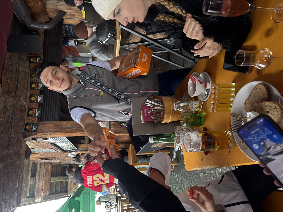 The image displays an outdoor bar area in St. Christoph, Austria, characterized by rustic wooden beam construction with snow and slush visible on the ground outside. Banners featuring "DIE NACHT MACHT ALLE" hang from overhead beams. In the center, a male subject with short dark hair, wearing a black cap, sunglasses on his cap, a grey sleeveless vest with a Jägermeister logo, and a white t-shirt, extends a pair of orange plastic sunglasses towards a partially visible hand on the left. His left arm holds an orange box labeled "Jägermeister ORANGE." Seated at a light brown wooden table in the foreground, a female subject on the right has long blonde braided hair and wears a white beanie and a black fur-trimmed jacket, with her hands clasped on the table. Visible items on the table include: a glass of beer, a glass of green liquid, a white teacup with a red design on a saucer (containing a red sugar packet and an empty creamer), a wooden caddy filled with various metal utensils, a green glass bottle of water, a clear glass bottle, a white plate with two slices of dark bread and a white substance, five small glass vials containing yellow liquid, and two stemmed glasses, one holding a reddish liquid and one empty. A dark smartphone is near the female's hands, and another smartphone displaying a lock screen with the time "12:44" and a mountain image is held in the lower-left by an unseen individual. In the background, a person wearing a red jersey with "O'CONNOR 22" on the back is visible. To the right, another male subject wearing a brown beanie is seated at a separate table, with an "Oakley" ski goggle case placed beside him. A speaker is mounted on a wooden beam, and a green canopy is partially visible in the far left background.