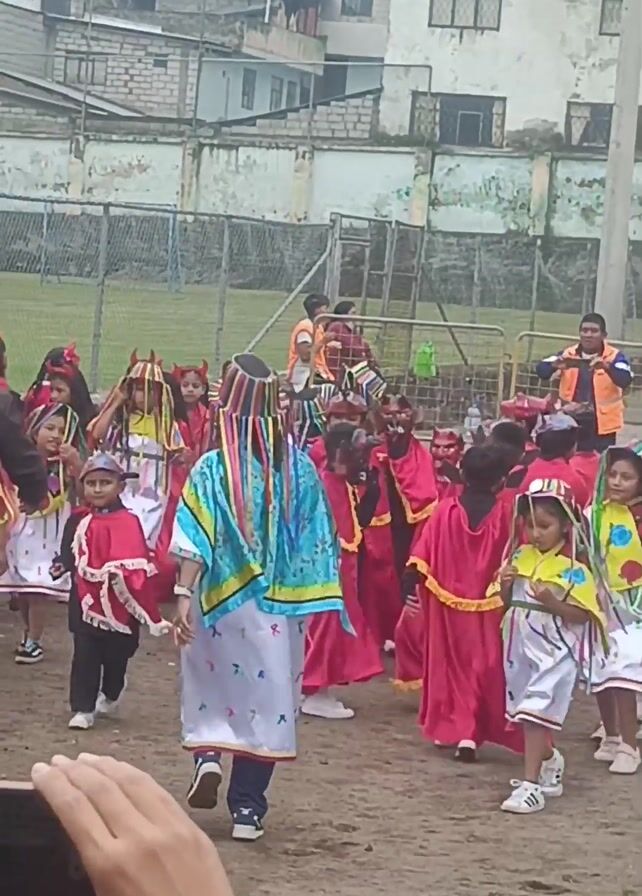 A video shows a group of children dressed in colorful traditional costumes participating in a procession. The children, who appear to be of elementary school age, are wearing outfits of various colors including red, white, yellow, and blue. Many of them have traditional headdresses with colorful ribbons, while some are wearing capes or hats that resemble devilish attire. They are walking together on a dirt field. A person is filming the procession on a phone. In the background, there are buildings, a chain link fence, and other adults observing the event. The sky is overcast.