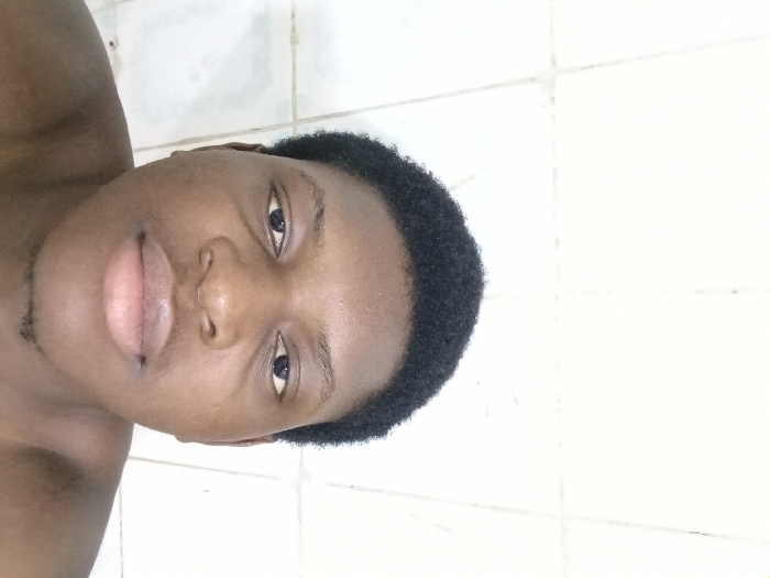 A close-up, angled shot of a dark-skinned man with short, dark hair. His face is centered, displaying his eyes, nose, and lips. Part of his shoulder is visible on the left. The background appears to be a white-tiled surface, possibly a wall or floor. The lighting seems bright, and the overall image is somewhat grainy.