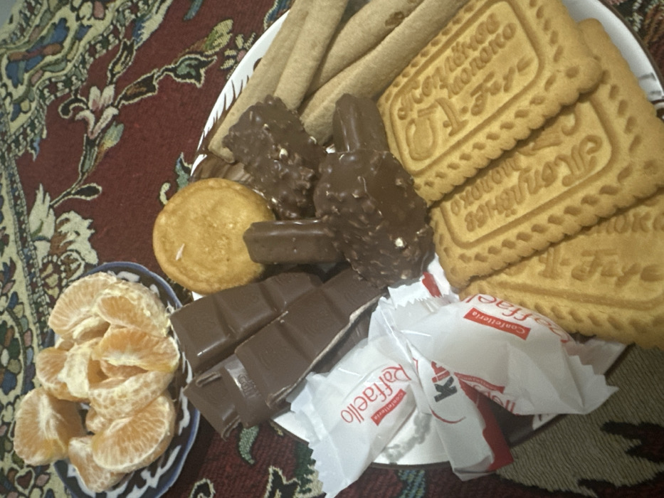 A plate filled with an assortment of treats. There are several rectangular biscuits with inscriptions, alongside long, thin waffle rolls. Chocolate-covered candies and a dark chocolate bar are visible. Round shortbread cookies complement the confectionary selection. A small bowl of peeled tangerine segments sits adjacent to the main plate, adding a touch of freshness. Wrapped candies are also present on the plate.