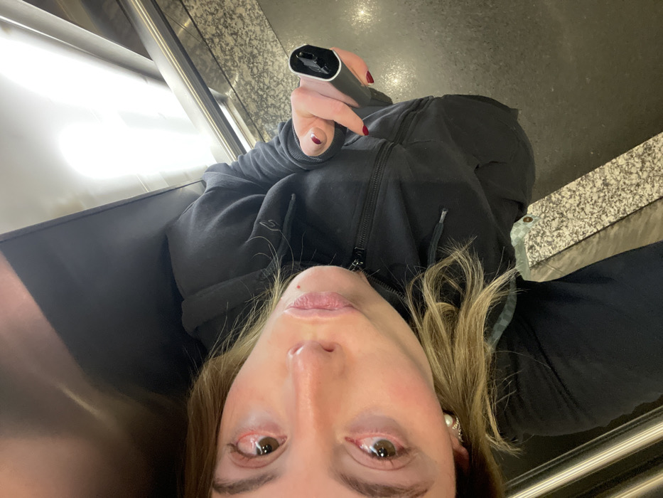 The scene depicts a single female subject captured in an upward-angled selfie within an enclosed space, identified as Mexico City, Mexico