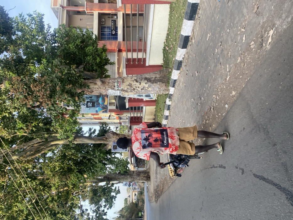 A man rides a bicycle on a paved road lined with trees. He wears a patterned shirt and shorts. A building is visible in the background. The road has a black and white curb. The man is facing away from the viewer. The lighting appears to be bright daylight.