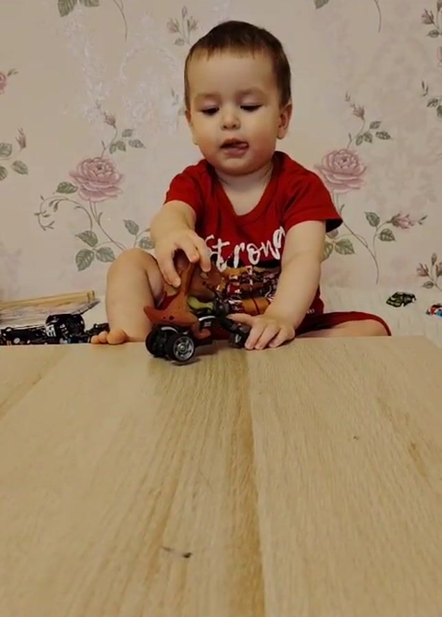 A toddler is sitting on a bed in front of a light-colored wooden surface. He is wearing a red short-sleeved shirt and red shorts. The shirt has the word "strong" written on it, along with graphics. The background is a floral wallpaper with a pink rose pattern. The toddler is playing with a toy that appears to be a dinosaur riding a motorcycle. The toy is mostly brown and black. The toddler holds the toy up in his hand and looks at it. There are other toy cars scattered on the bed behind him. The lighting is indoor, and the camera angle is slightly below the toddler.