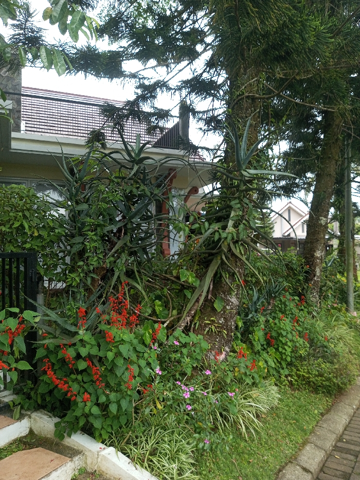 A lush garden overflows with greenery and vibrant flowers. Towering pine trees host broad-leafed aloes. Vivid red salvia blooms are scattered alongside small, delicate pink flowers. A small portion of a house is visible behind the plants, with a brown-tiled roof and white facade. A black iron fence adds a touch of order amidst the abundant foliage. The curb marks the edge of a paved surface alongside the garden.