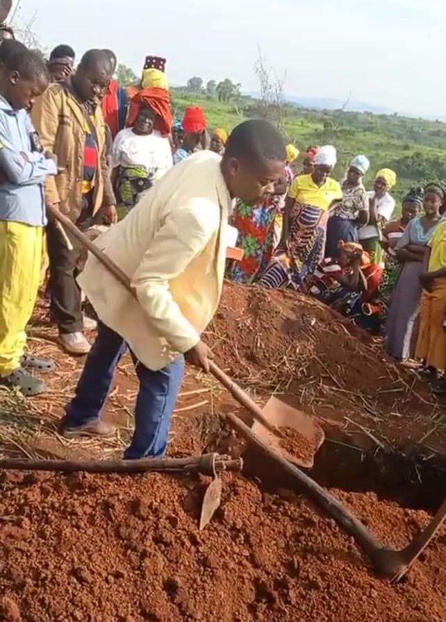 man in a light-colored jacket and blue jeans using a shovel to dig into a mound of red soil. Several other people stand around the mound, observing. There are shovels and a hoe lying on the ground near the man. The background shows a landscape with trees and distant hills under a bright sky.