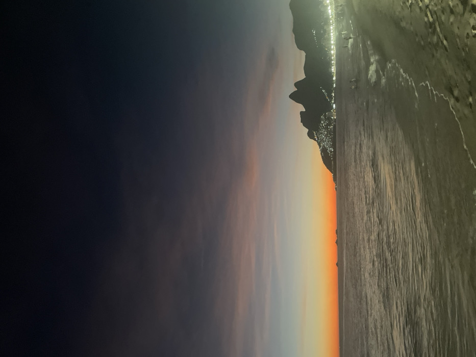 A landscape photograph, rotated for vertical display, captures a coastal scene at twilight