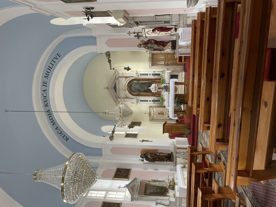 The interior of a Catholic church in Donja Lastva, Montenegro, is depicted
