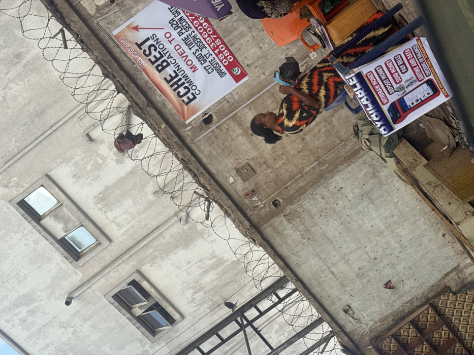 The image displays an outdoor commercial scene in Aguata, Nigeria, specifically near "C17 GOD'S TIME PLAZA OPPOSITE ST. JOSEPH'S SECOND GATE," as indicated on a prominent banner. The background consists of a weathered, light-colored concrete building with two visible rectangular windows on its upper facade; one is partially open. A vertical drainage pipe runs down the building's exterior. A concrete wall or barrier, topped with razor wire, bisects the scene horizontally. A dark fabric item is snagged on the razor wire. To the far left, a metal structure is visible, with a small bird perched on one of its beams. In the mid-ground, a woman with dark skin and hair pulled back is seated on a blue plastic stool. She wears a long dress with a distinctive black, orange, and white zig-zag pattern. She holds a black pouch and a light blue device, consistent with a mobile payment terminal or smartphone, in her lap. To her right, an orange plastic stool is partially visible, along with a light-colored container and a partially obscured individual. A camouflage-patterned bag rests on the ground behind the seated woman. Two signs are prominently displayed: 1. A white banner with red and black text for "ECHE BEST COMMUNICATIONS" announcing its relocation "TO C17 GOD'S TIME PLAZA OPPOSITE ST. JOSEPH'S SECOND GATE," accompanied by two phone numbers (0813960976 and 08087096). 2. A white, rectangular sign leans on the ground, advertising various services under the heading "AVAILABLE" in blue and red text. These services include "WITHDRAW MONEY, DEPOSIT MONEY, SEND MONEY, PAY BILLS, AIRTIME AND DATA, CHECKING OF BALANCES," and the sign features a graphic of a mobile point-of-sale (POS) terminal. A contact number (07064719293) is printed at the bottom. The arrangement suggests an informal roadside business operation offering communication and financial services.