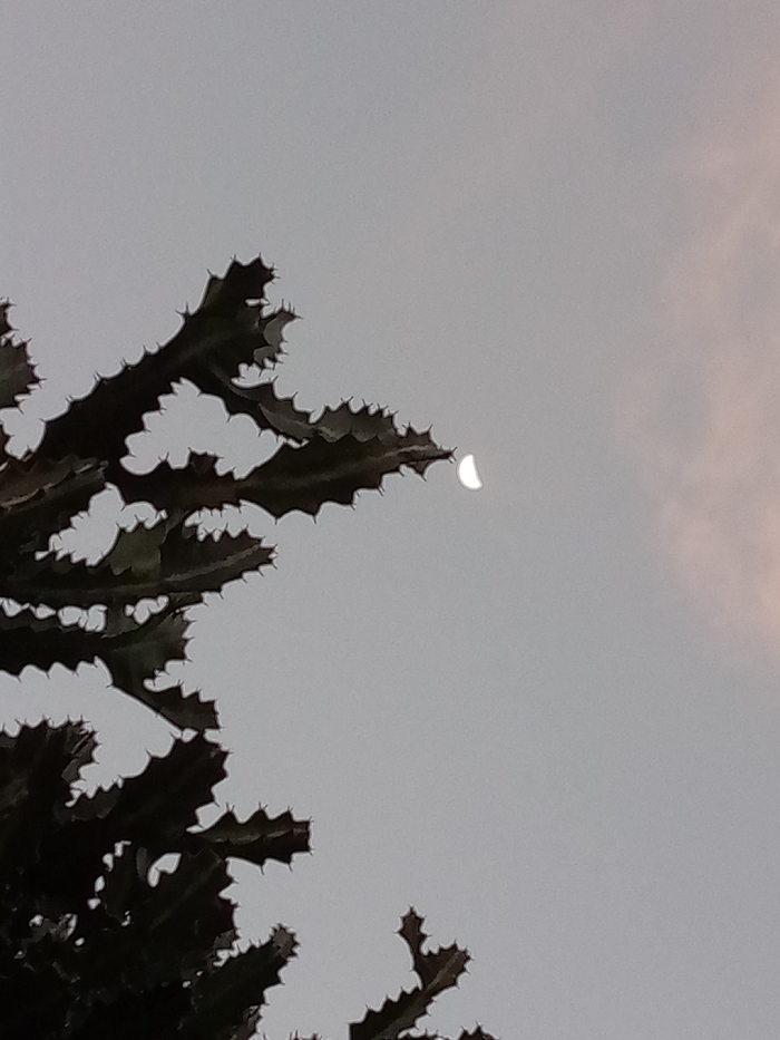 A silhouette of a Euphorbia plant fills the left of the frame, its spiky branches reaching towards the upper right. A sliver of the moon peeks from behind a branch, glowing brightly against the overcast sky. The sky is a uniform grey, with subtle pink hues in the upper right corner. The image is taken from a low angle, emphasizing the height of the plant and its contrast against the muted sky.