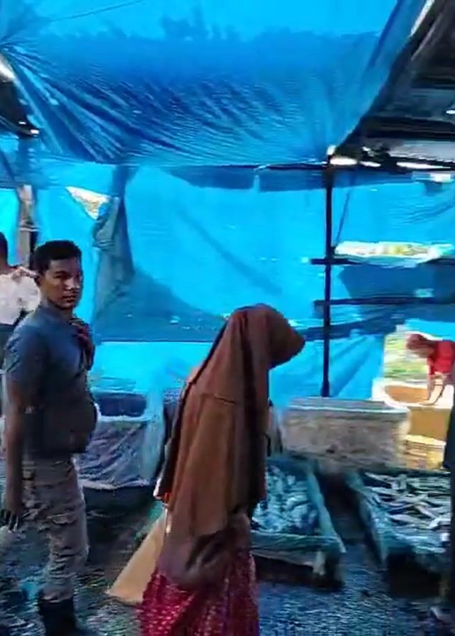 The video depicts a bustling fish market under a corrugated metal roof and a blue tarp. Several people are walking around, some wearing hijabs or face masks. There are containers of fish visible, and the floor appears to be wet. The atmosphere suggests a busy commercial environment.