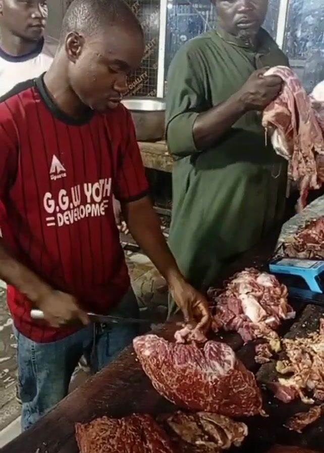 In a well-lit indoor setting, three men are gathered around a large wooden table covered with pieces of raw meat. The primary focus is on two men who appear to be butchers. The man on the left, wearing a red shirt with black stripes and the text "G.G.W. YOUTH DEVELOPMENT" along with blue jeans, is actively cutting the meat with a knife. The man on the right, dressed in a green robe, is holding up a large piece of meat while seemingly instructing or assisting the other butcher. A third man, wearing a white shirt, stands in the background. The table is littered with various cuts of raw meat. In the background, there are shelves, a window, and other objects that suggest a butcher shop or meat processing area. A blue electronic scale is also visible on the table.