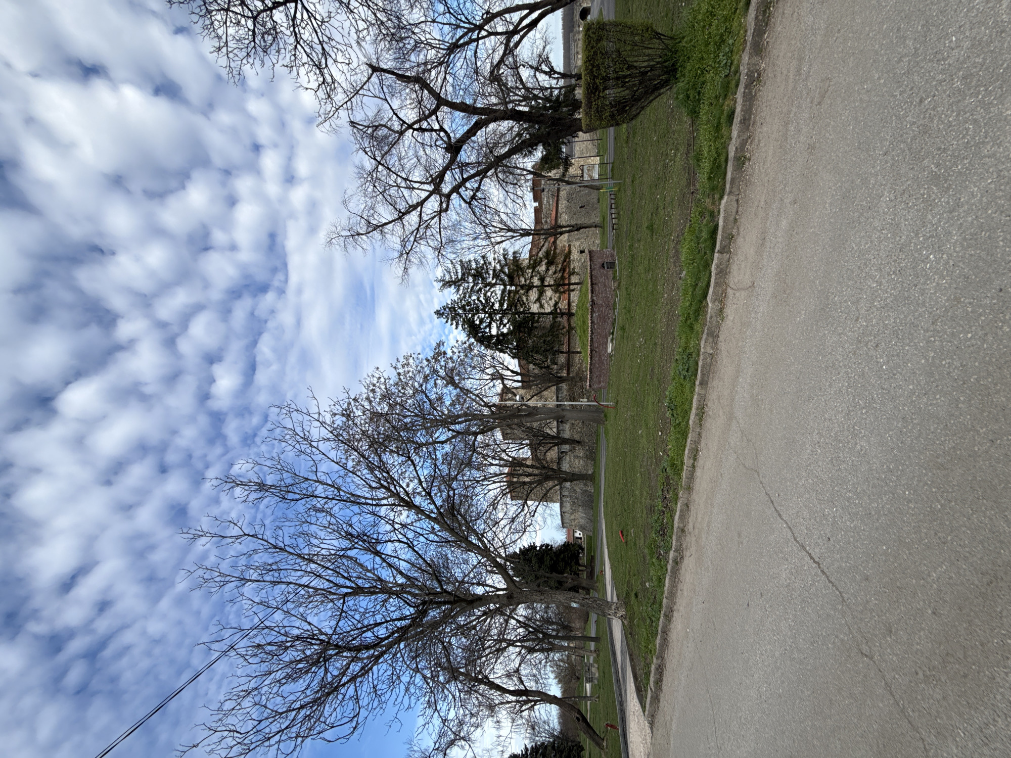 The scene depicts a view of the Baba Vida fortress in Vidin, Bulgaria, framed by bare trees against a partly cloudy sky. The fortress is partially visible through the trees, with its stone walls and red-tiled roofs. A grassy area and a paved road edge the scene. No people or subjects are visible. The environment suggests a transition from late autumn to early spring. Utility lines are visible.