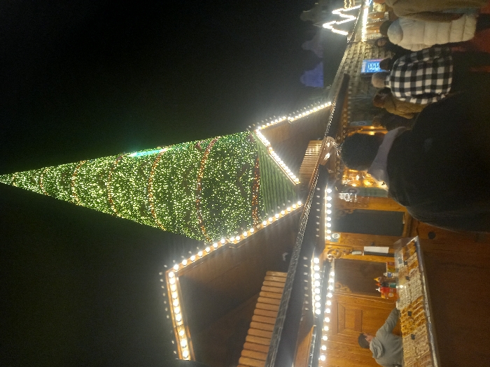 An outdoor Christmas scene at night. A large, brightly lit Christmas tree dominates the left side. To the right, people are gathered around a wooden booth decorated with lights. The booth appears to be a vendor stand. The scene conveys a festive and celebratory atmosphere.