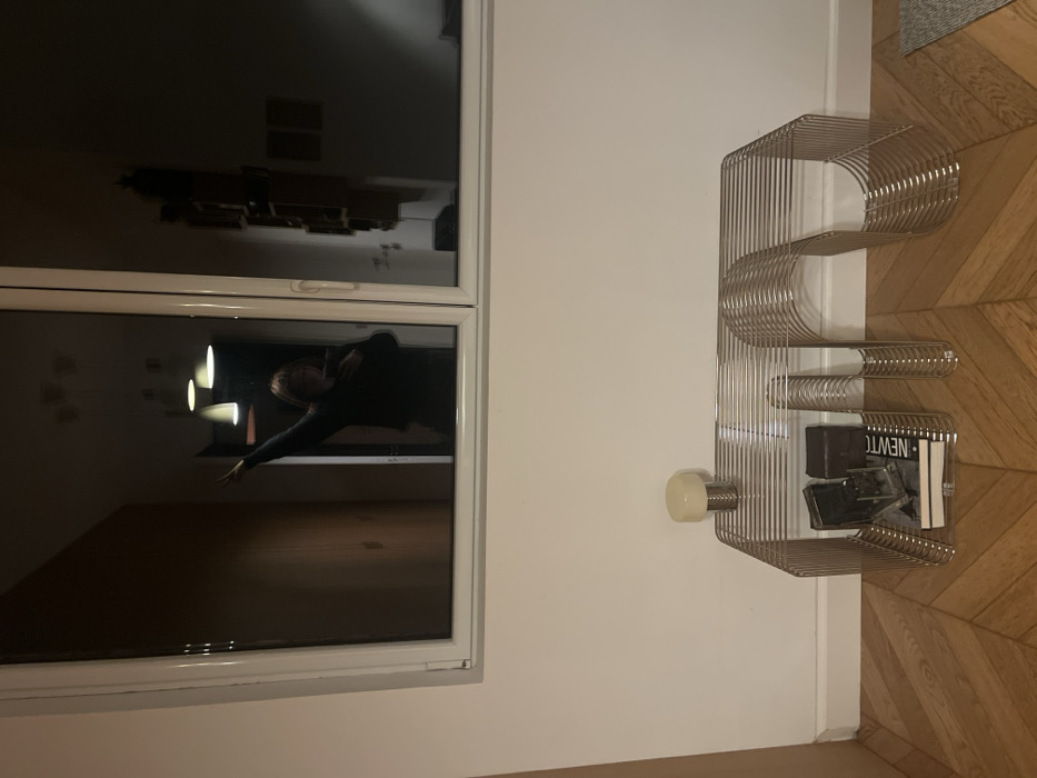 A modern interior features a window reflecting a person pointing outward. The window frame is white. A chrome magazine rack with rounded shelves stands against a white wall, holding magazines and a small object. The floor is parquet. A wall-mounted light fixture is attached to the magazine rack.