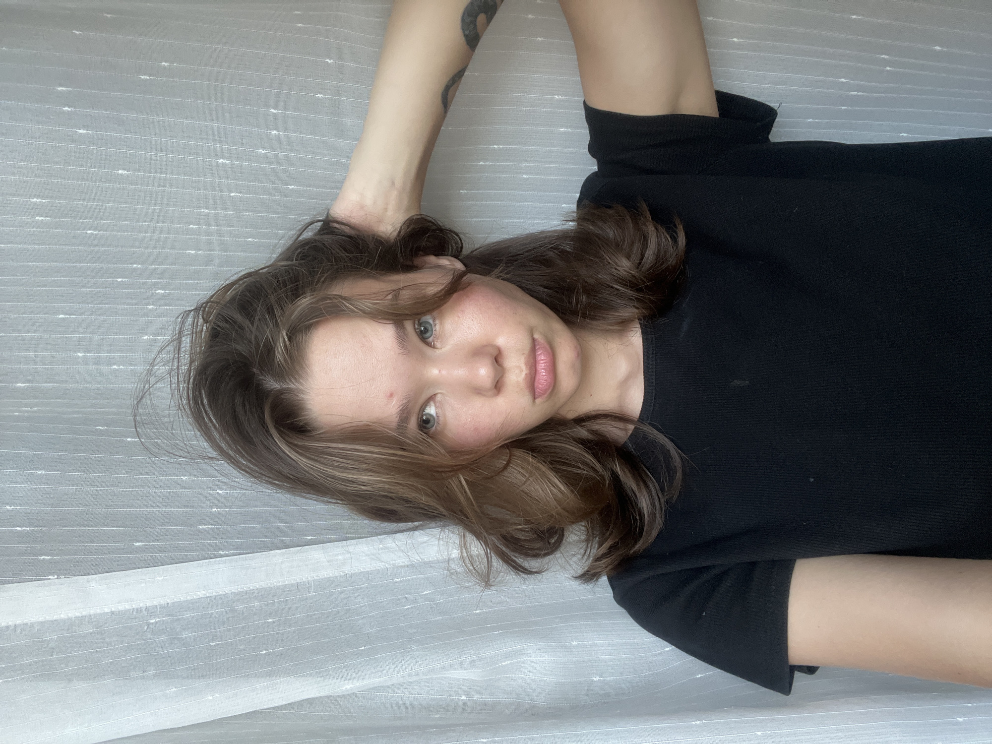 A frontal portrait depicts a young adult female, approximately 18-30 years of age, indoors in Nha Trang, Vietnam. The subject has medium-length wavy brown hair, blue-grey eyes, and a fair complexion exhibiting minor reddish blemishes on the forehead and cheeks. She wears a black, ribbed short-sleeved top. Her left hand is raised and partially obscured in her hair on the left side of her head, indicating an action of adjusting or styling hair. A dark, curvilinear tattoo is partially visible on her right upper arm, near the bicep/tricep area. Her lips are slightly pursed, conveying a pout. The background consists of two panels of light-colored, sheer curtains with fine vertical stripes and small, intermittent white textured dots. The left curtain panel appears brighter than the right, suggesting a light source from that direction. The image crops the subject from approximately the upper torso upwards.