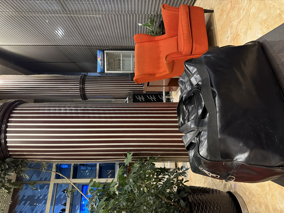 This image displays a modern interior lounge or waiting area located in Addis Ababa, Ethiopia, identifiable by the "aqua addis" branded refrigerator. In the foreground, a large black duffel bag, possibly made of synthetic leather, featuring a zippered main compartment and carrying straps, rests on a dark surface. To the left, a potted plant with green foliage occupies a textured black pot, positioned in front of a large window with blue-tinted glass that shows a blurred urban scene or building interior. Two prominent, fluted columns with alternating dark brown and light vertical stripes stand in the midground. To the right, an orange upholstered wingback armchair with button detailing is situated next to a wooden desk or counter. Further to the right, against a wall covered with grey horizontal blinds, a white glass-door refrigerator branded "aqua addis" contains water bottles. The floor is composed of polished light-colored tiles. No individuals are present in the scene.